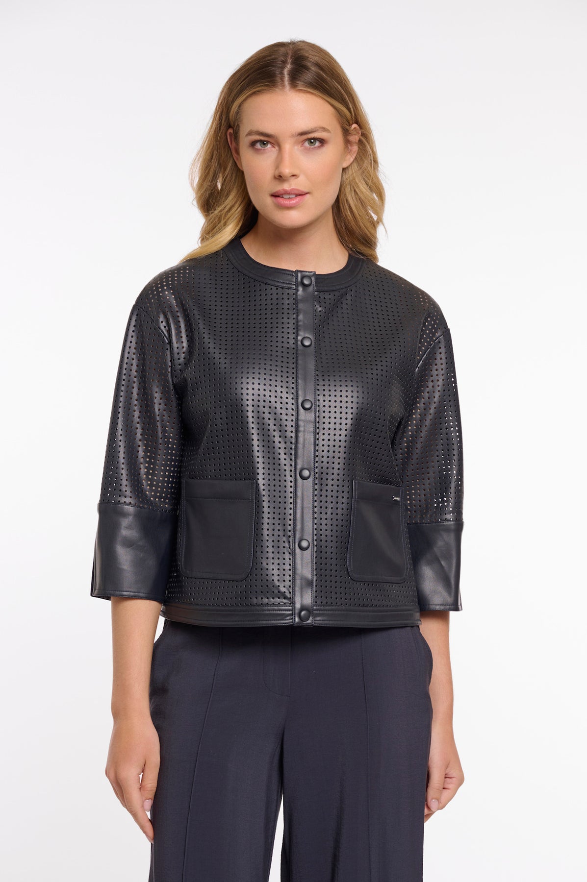This perforated faux leather jacket by Rino & Pelle combines airy detailing with a structured shape. Designed with a sleek button closure, two front pockets, and subtle sleeve slits, it balances functionality with refined style. The cropped silhouette and soft finish embody effortless chic.