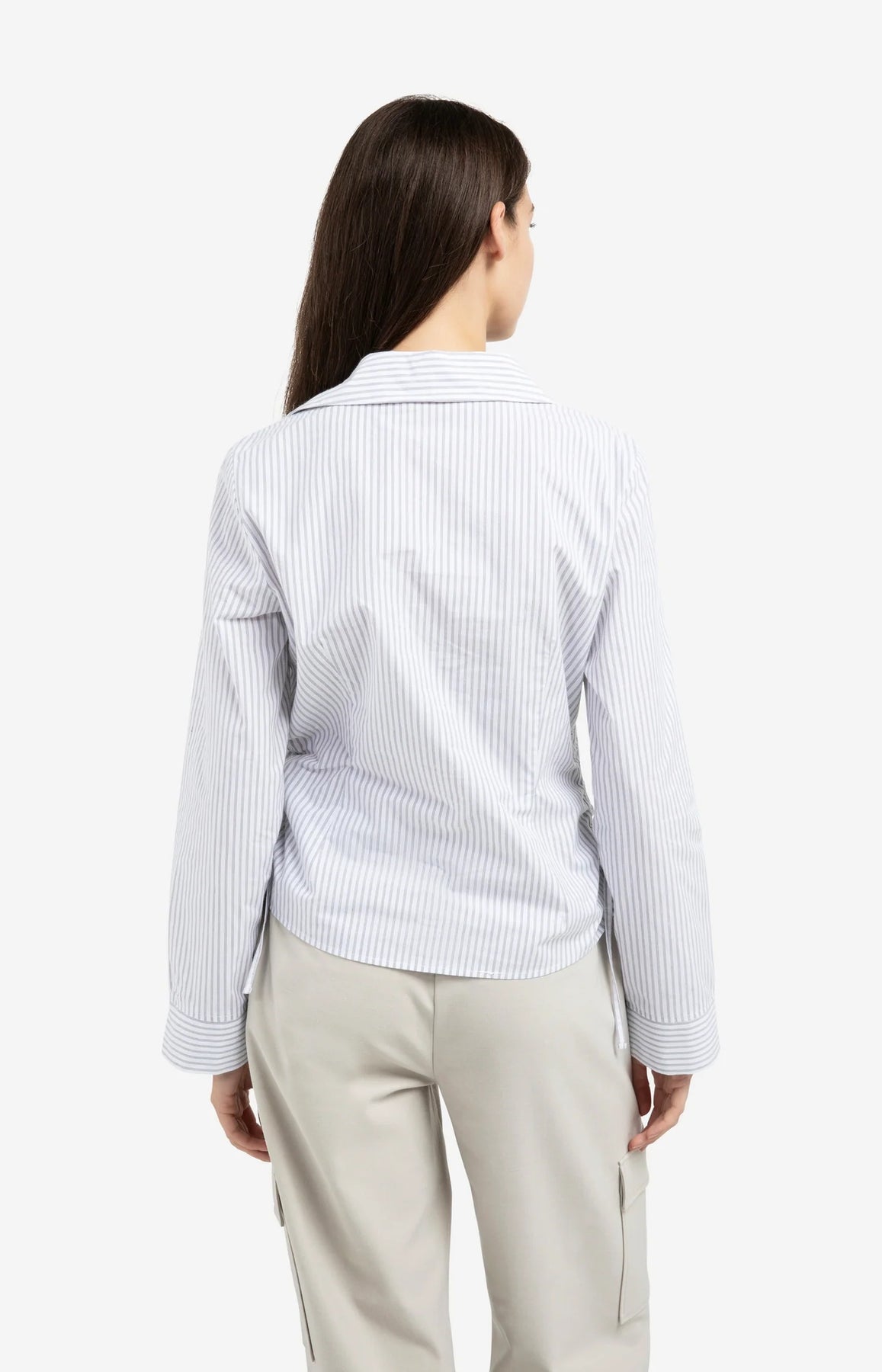 This striped grey blouse by YAYA features a fitted silhouette, classic collar, and long sleeves with wide cuffs. The drawstrings at the sides allow you to adjust the waist for a flattering fit. Subtle contrast in stripe direction at the cuffs adds a refined detail. The model is 175 cm and wears size 36.
